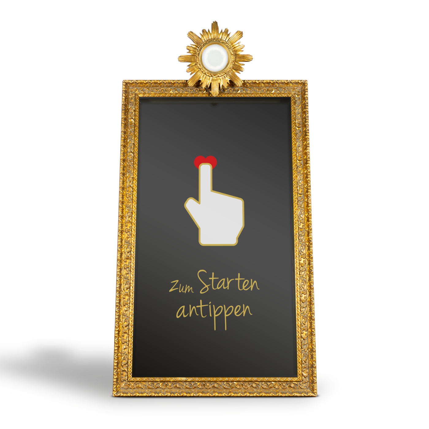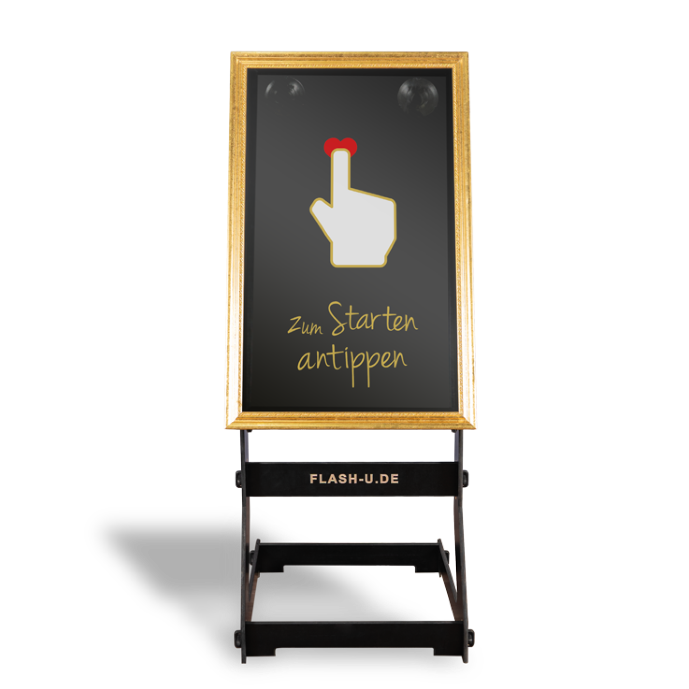 Barocke Verkleidung mit modernster TechnikDiese Fotobox tarnt sich als barocker Spiegel, doch wenn man vor ihm steht, erkennt man den Touchscreen in ihm. Besonders geeignet für kleinere Hochzeitslocations, da er nicht so viel Platz braucht. Ein Branding ist bei diesem Modell leider nicht möglich, aber das hat er aber auch nicht nötig. Bei ihm könnt ihr auch frei in den Raum fotografieren oder ihr lasst ihn vor einem schönen Hintergrund aufbauen.